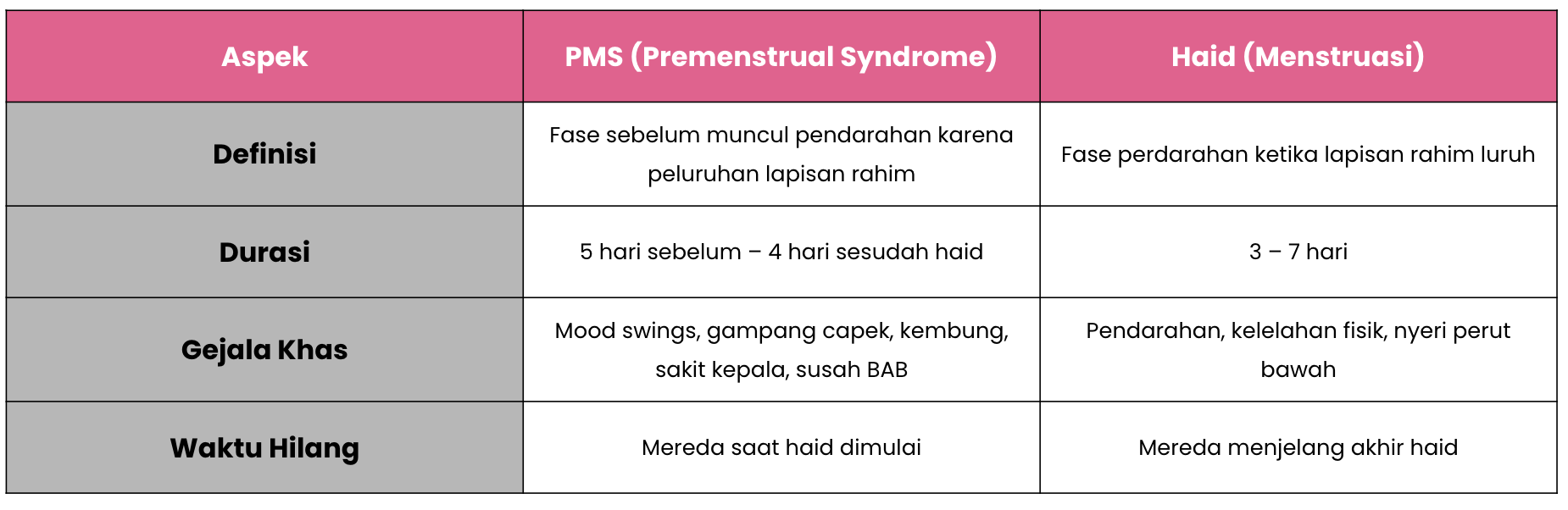 Penting banget tahu bedanya PMS dan haid. PMS muncul sebelum darah menstruasi keluar, sementara haid adalah fase perdarahan ketika lapisan rahim luruh. PMS terjadi karena perubahan hormon yang memengaruhi otak dan sistem saraf, kombinasi antara estrogen, progesteron, dan serotonin yang menimbulkan gejala fisik dan emosional.